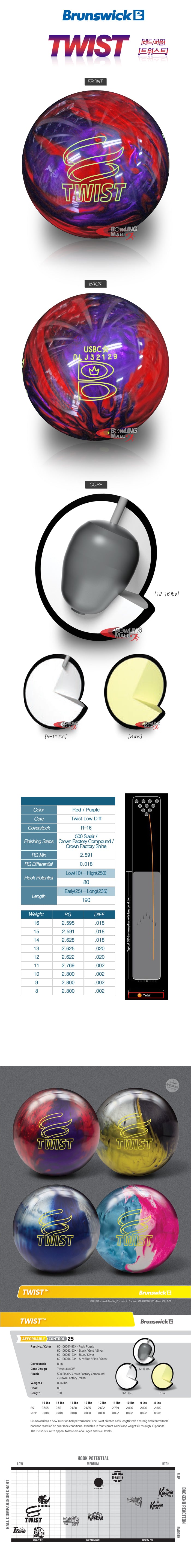 Brunswick has a new Twist on ball performance. The twist creates easy length with a strong and controllable backend reaction on drier lane conditions. Available in four vibrant colors and weights 8 through 16 pounds. the Twist is sure to appeal to bowlers of all ages and skill level.